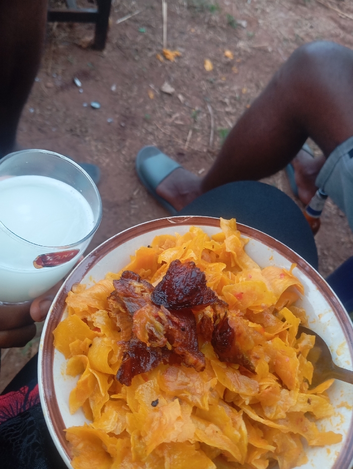 A bowl of what appears to be cooked plantains, topped with dark, roasted meat pieces, sits on a person's lap. A glass of white liquid, possibly milk, is held alongside. The scene is outdoors, evidenced by the ground and legs of people wearing casual footwear. A beer bottle is partially visible in the background.