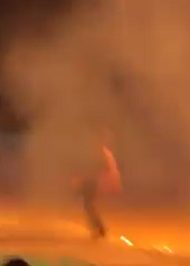 At night, a man performs a fire spinning routine on a lawn near a restaurant. The restaurant, named “The Cliff” is in the background, lit with red neon. The man spins two flaming torches in each hand. There are other people watching, including one standing by with a fire extinguisher. The lawn is lit with blue and green lights. The scene is smoky, likely from the fire display.