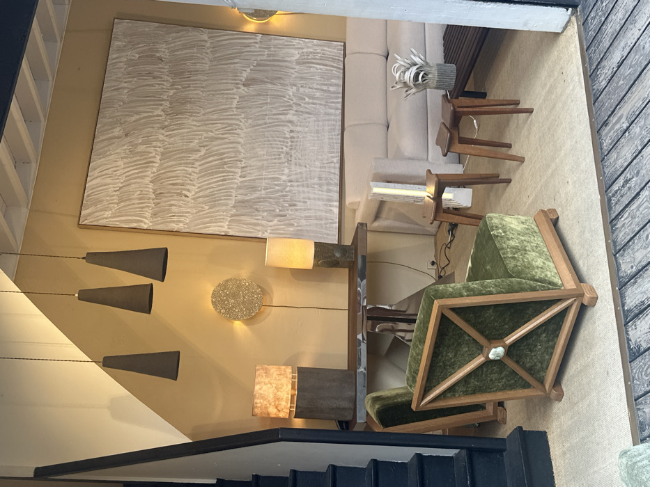 This image depicts an interior space, likely a commercial showroom or curated exhibit, located in Saint-Ouen-sur-Seine, France. The floor is covered by a light-colored, woven area rug. A green velvet armchair with an exposed wooden frame and an 'X'-shaped design on the backrest, accented by a central pale disc, occupies the left foreground. Two dark-stained wooden stools with curved seats are positioned centrally on the rug, forward of a light-colored, modular three-seater sofa. A tall, rectangular, illuminated transparent object stands beside the left stool. To the right, a dark-slatted rectangular bench holds a clear glass vase containing white, twisted decorative elements. The back wall is painted a warm ochre color. A console table with a dark, reflective top and a polished, mirrored base stands against this wall. On the console, a table lamp with a patterned orange drum shade and a dark cylindrical base is on the left. To its right, another table lamp features a tall, plain white cylindrical shade on a textured dark base. Between these lamps, a circular, textured gold wall sconce emits light. Three dark, conical pendant lights hang from the white ceiling, casting light downwards onto the wall. A large, square abstract painting with pronounced, undulating horizontal white textures is mounted on the wall above the sofa. On the far left, a dark-painted staircase with solid banisters ascends diagonally. The floor outside the main rug area consists of dark wooden planks. No people or animals are present.