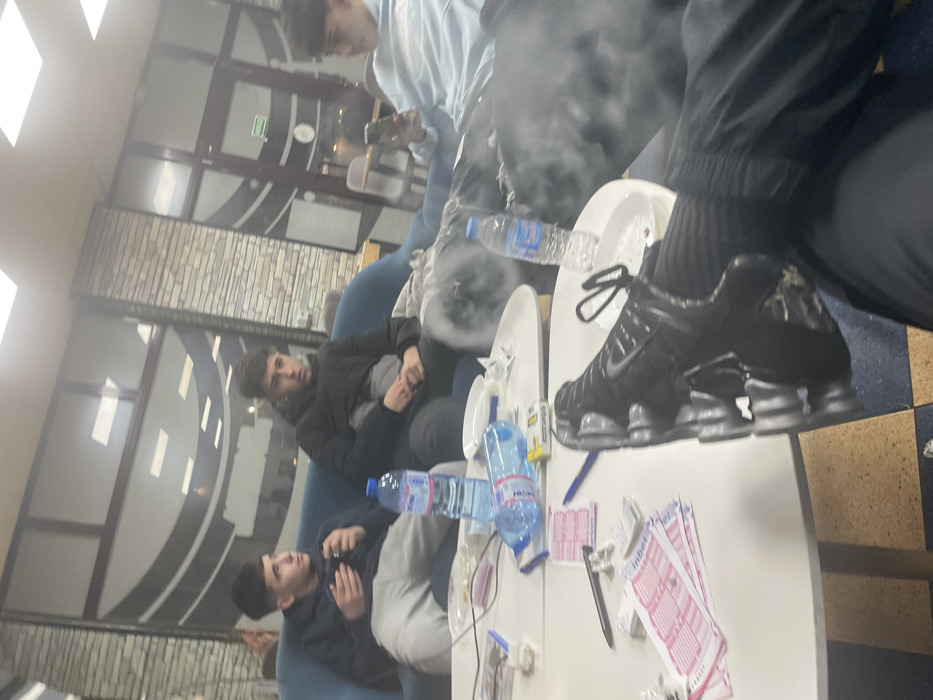 An interior view depicts a casual lounge or cafe setting in Botevgrad, Bulgaria, based on visible product branding (Devin water, Inbet slips). The scene includes four young males in a relaxed environment with artificial lighting. On the left, two males are seated on a blue upholstered sofa. The leftmost subject wears a dark hoodie and light pants, holding a white gaming controller. Adjacent to him, a second male in a dark hooded jacket and dark pants has a dark bag slung across his chest; he gazes forward. Further right, a third male sits on another blue sofa, wearing a light-colored long-sleeved top and looking down at a smartphone he holds. The foreground features multiple light-colored tables. Resting prominently on one table is a black Nike Shox sneaker worn by a fourth, unseen individual, whose legs are clad in dark pants and socks. The tables are cluttered with objects including two plastic bottles of Devin brand mineral water (one upright, one tipped), several stacks of Inbet betting slips with red markings, at least two dark pens, a white and yellow cigarette pack, and a small white dish, possibly an ashtray. Significant plumes of white smoke or vapor emanate from the lower right and center of the frame, obscuring portions of the background and indicating an active smoking or vaping activity. The background displays large windows reflecting interior light, flanked by walls adorned with horizontal, stacked stone or tile paneling. The flooring visible in the bottom right shows a pattern of blue and beige/brown tiles or carpet.