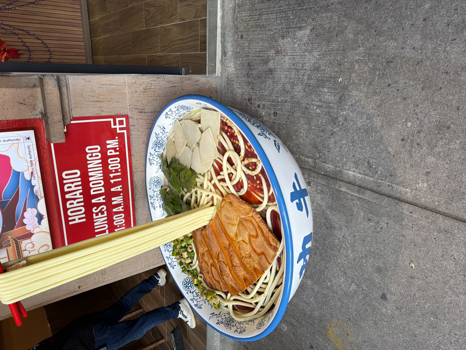 A large bowl of noodle soup, likely ramen, sits outside a restaurant with a red sign indicating hours of operation ("Lunes a Domingo 1:00 A