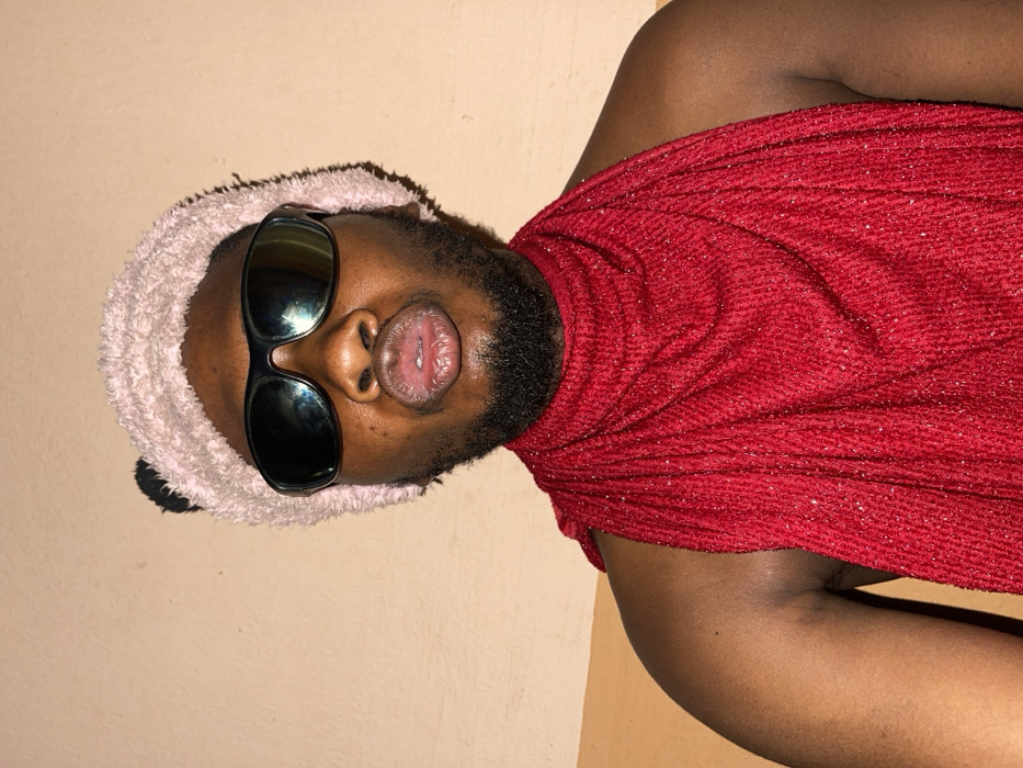A person with dark skin, sunglasses, and a furry pink hat with black panda ears is turned sideways. They have dark, short facial hair and puckered lips. Draped over the shoulder is a red shimmering fabric. The background is a pale peach color. The person's skin is smooth, and their left arm is visible on the right side of the image.