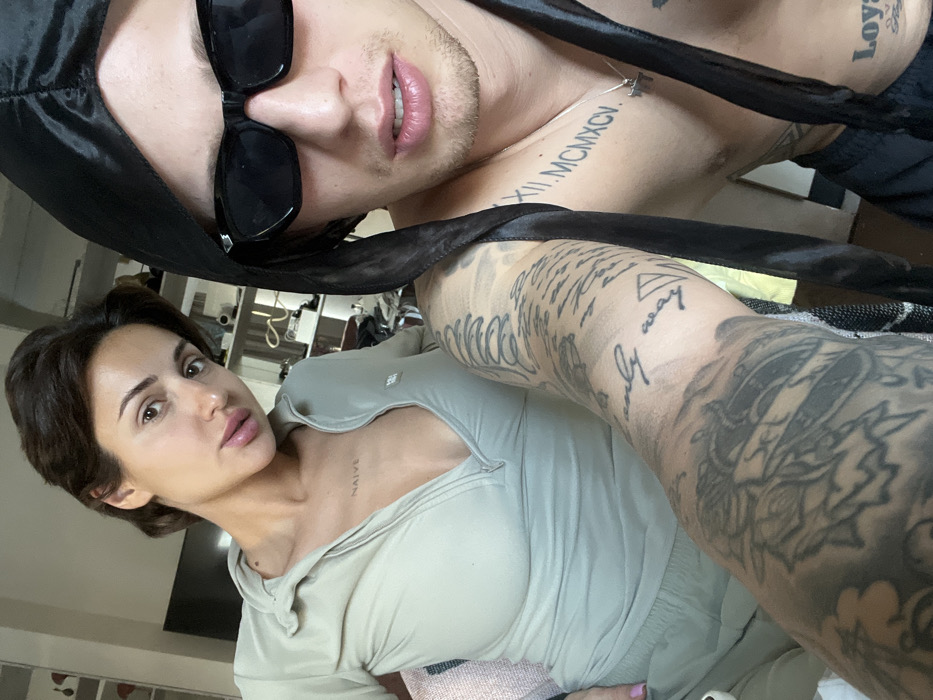 The image depicts two individuals, one female and one male, captured in what appears to be an indoor selfie. The female, positioned on the left, has dark brown, short hair and light brown eyes. She has full lips and appears to have minimal makeup. She is wearing a light olive-green long-sleeved top with a half-zip closure, partially unzipped to reveal her upper chest. A small tattoo reading "naive" is visible on her sternum, and a small white emblem is present on her left chest area. Her left hand's pinky finger has pink nail polish. She is looking directly at the camera. The background behind her is a light-colored wall, with a dark, rectangular object (possibly a television screen) partially visible in the upper left. The male, positioned on the right and closer to the camera, is wearing a black durag or head covering that drapes over his left shoulder. He wears black rectangular sunglasses. He has visible stubble on his face. His upper torso is bare, displaying extensive tattoos including Roman numerals "XII. MCMXCV." below his left collarbone and "Loyal" near his lower right ribs. A silver pendant hangs from a thin chain around his neck. His right arm, which appears to be holding the camera, is also heavily tattooed with various designs and script, including "only way." He is looking directly at the camera with his mouth slightly open. The background behind him shows blurred shelving units with various objects, suggesting an indoor, possibly cluttered, residential setting. A white doorway is partially visible in the far right background. The location in the city of Khimki, Russia, cannot be determined from the visual information provided in the image.