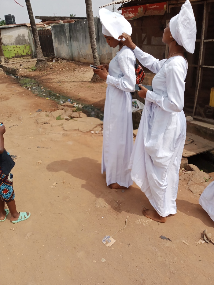 This image depicts a scene on an unpaved dirt road in Iju, Nigeria, under daylight conditions. Two young women, dressed in white robes and white head coverings, are central to the frame. The woman on the left is observed holding a smartphone in both hands and appears to be looking at its screen. A patterned bag or backpack is visible on her back. The woman on the right has her right hand extended towards the left woman's head, possibly adjusting the head covering, while holding a second smartphone in her left hand. Both central women are barefoot. To the immediate left, a third individual, likely a child, is partially visible, wearing patterned shorts and light blue sandals. The environment includes a prominent open drainage ditch filled with stagnant water and debris running parallel to the road on the left. In the background, multiple buildings of varying construction are visible, including one with a corrugated iron roof and a red banner displaying "Chivita" branding. Several tall, slender palm trees are interspersed throughout the background. The ground is a reddish-brown dirt surface with scattered small pieces of refuse. Shadows indicate a high sun angle.