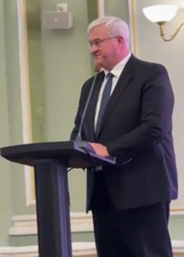 A man in a black suit and navy blue tie stands behind a black podium and addresses an audience. He has gray hair and glasses. The podium has a microphone attached to it. Behind him, the wall is light green with gold trim. A small speaker is mounted on the wall to his left. A sconce is on the wall to his right.