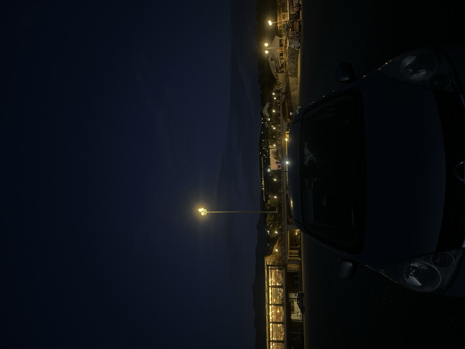 The image depicts an outdoor night scene in Zagora, Montenegro. In the foreground, a dark-colored Nissan vehicle is parked centrally, facing the viewer, with its front end, including headlights and grille, partially visible but largely in shadow. The midground is illuminated by a prominent, tall streetlamp emitting a bright yellow-orange light. To the left of this streetlamp, a large, multi-story building, possibly a commercial establishment or restaurant, is brightly lit from within, revealing numerous windows and structural details. A second, darker vehicle is partially visible near this building. To the right of the main streetlamp, an elevated road or bridge structure is present, extending towards the right edge of the frame. Beyond this structure, multiple smaller buildings and additional streetlights are visible on an ascending landscape. The background features the dark silhouettes of distant mountains or hills against a deep blue-black night sky. No individuals, specific actions, or interactions are discernible within the frame. The scene is static, characterized by artificial lighting against a nocturnal backdrop.