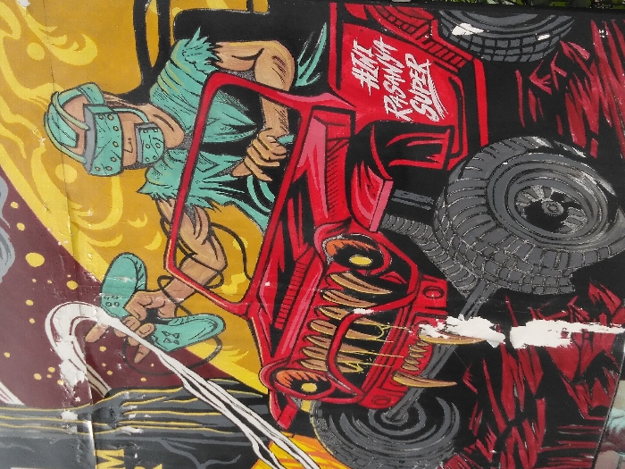 A stylized mural or street art is depicted, located in the city of Otta, Norway. The artwork features a human figure from the chest up, wearing a light teal, tattered garment and a segmented, metallic light teal virtual reality headset that obscures their face. The figure's tan-colored hands are positioned as if driving a vehicle; one hand is on a steering wheel, while the other holds a light teal video game controller. The vehicle is a red, custom-styled off-road jeep or monster truck with an aggressive, monster-like front grille composed of prominent yellow-orange fangs, from which yellow fluid drips. It is equipped with large, dark gray, heavily treaded tires. White text reading "#HTLT RASANYA SUPER" is visible on the side of the red vehicle. The background includes an abstract, wavy yellow-orange section behind the figure's head, a dark, pillar-like structure on the far left, and a dark red, patterned ground beneath the vehicle. The mural exhibits minor surface wear and peeled paint in several areas.