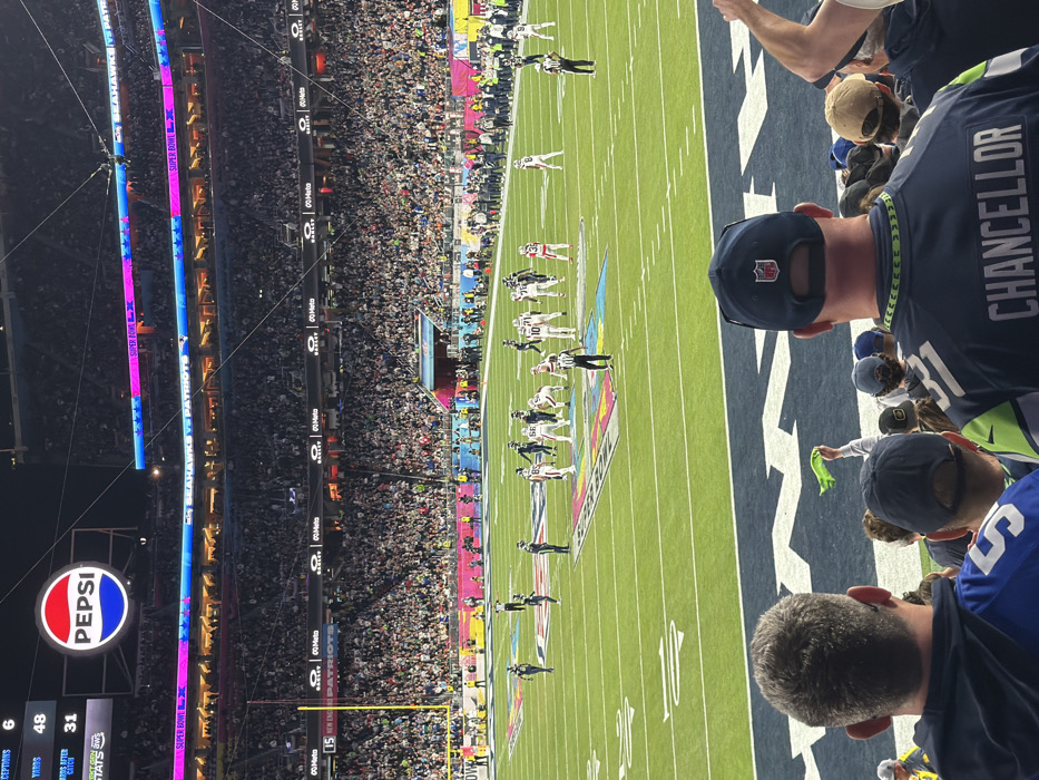 The image captures an American football game, likely the Super Bowl, from a fan's perspective