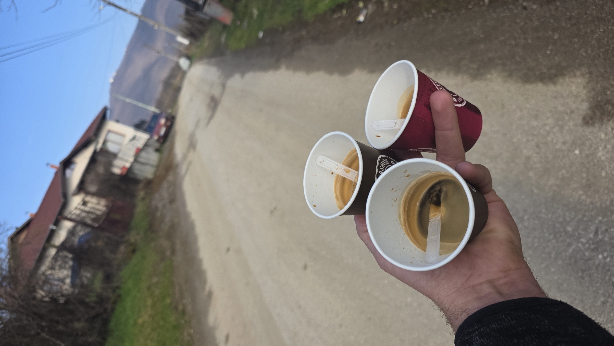 - "A male right hand, partially clad in a dark sleeve, occupies the lower left foreground, holding three disposable coffee cups" by FM-3O4tD2, licensed under CC BY 4.0