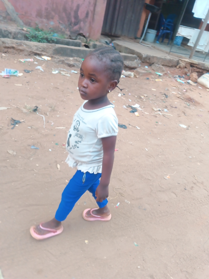 A young child stands outdoors on a sandy ground with scattered debris. She is wearing a white t-shirt with a graphic, bright blue pants, and pink flip-flops. Her hair is styled in braids. She is looking towards the left, her expression thoughtful. In the background, there's a building or structure with some discarded items, suggesting a somewhat impoverished environment.