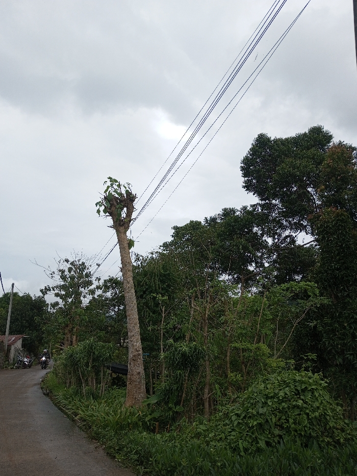 This image depicts a rural or semi-urban scene in Ambakirano, Madagascar, under an overcast sky. A paved, dark-colored road curves from the lower left towards the mid-left. Along the right side of the road, dense green vegetation comprising shrubs and trees lines the pathway. A prominent, tall, slender tree trunk, severely pruned or defoliated with new green sprouts emerging from its crown, stands centrally and leans slightly to the right. Overhead, multiple thin, dark lines, indicative of power or communication cables, stretch diagonally across the upper portion of the frame from left to right. To the far left, a small structure with a light-colored roof is partially visible. Two motorcycles are present on the road: one darker-colored motorcycle is operated by an individual, moving away from the viewer, while a lighter-colored motorcycle is parked closer to the structure. The background is dominated by a dense canopy of various green trees and foliage.