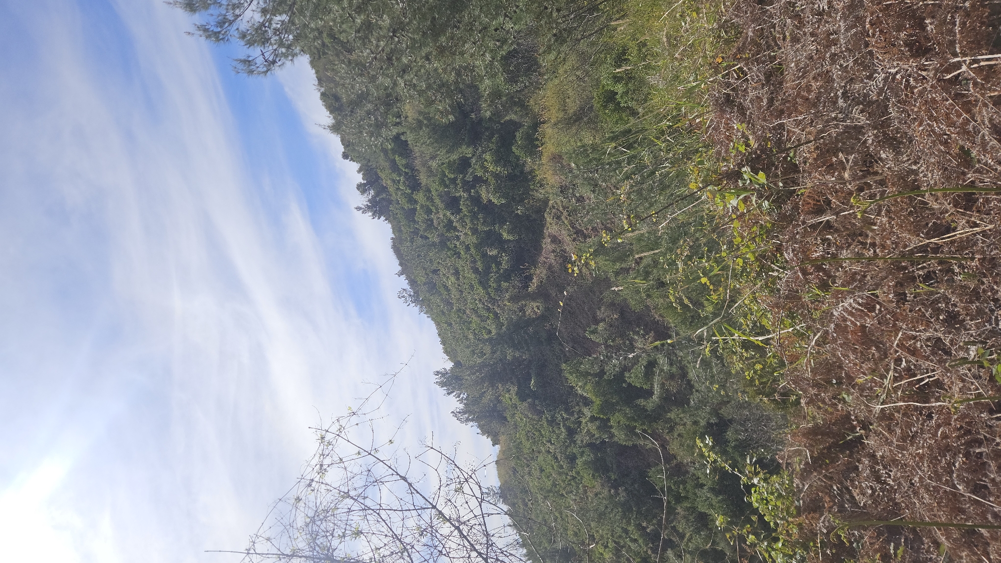 landscape in Budva, Montenegro. The sky is blue with wispy white clouds. A densely vegetated hillside dominates the frame, composed of green trees and undergrowth transitioning into brown, dried vegetation on the right. In the foreground, bare branches of a tree are visible against the sky. The sun shines from the bottom left corner.