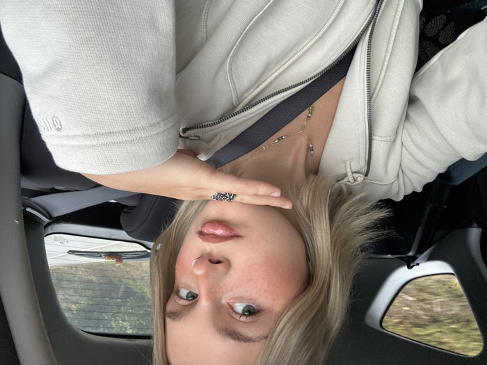 A young Caucasian female, approximately late teens to early twenties, is depicted seated inside a vehicle in West Vancouver, Canada. She possesses shoulder-length blonde hair, green eyes, light freckles across her cheeks, and a silver-colored nose ring in her left nostril. Her lips appear glossy. She is wearing a light beige, full-zip hooded jacket, partially unzipped, revealing a dark undergarment. A silver-toned necklace featuring small green and dark beads, with a longer green pendant, is visible around her neck. Her right hand, adorned with a dark, intricate ring on the ring finger, is positioned with fingers resting near her chin/jawline, palm angled towards her face. A dark-colored seatbelt crosses her diagonally from right to left. The interior of the vehicle includes dark headrests and seatbelts. Through the rear window, a paved road surface is visible, flanked by green foliage. A small, light-brown object, possibly a food item, rests on the rear parcel shelf, adjacent to the base of the rear windshield wiper. The view through the side window exhibits blurred green and brown vegetation, suggesting the vehicle is in motion.