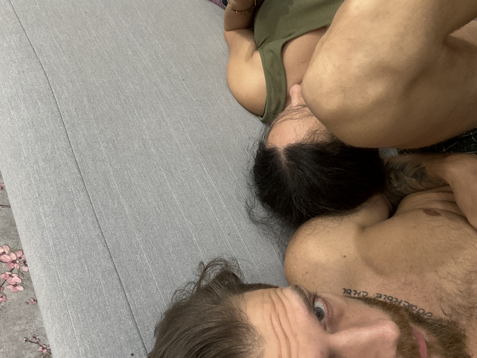 A couple is lounging on a light gray couch. One person is wearing a green tank top, their dark hair visible. The other person is shirtless, sporting a beard and a tattoo on their chest. The couch has subtle pinstripes. The camera angle is overhead, giving a close-up view of their faces and upper bodies. A small section of a floral pattern is visible in the lower-left corner.