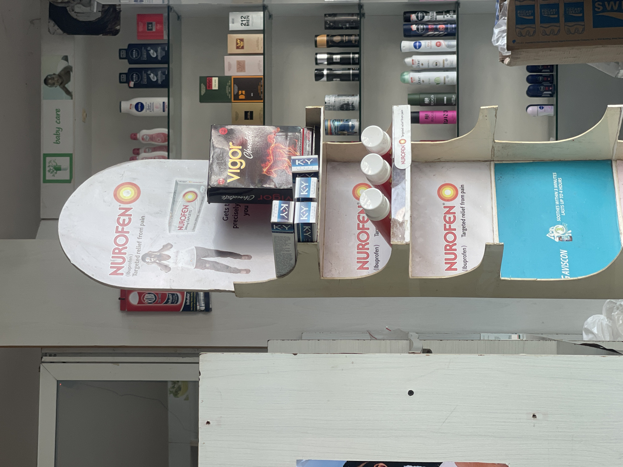 This is an indoor shot inside a store in Ado, Nigeria. The camera is positioned at eye-level, looking at a display case containing various hygiene products, pharmaceuticals, and confectionery items. The display features brands like Nivea, Dove, Hugo, and 212 Men. Pharmaceutical products like Nurofen and Gaviscon are also on display. The confectionery item is Vigor Chocolate. Several bottles of medication with white caps and red labels are also visible. The display case is primarily white, with a boat-like structure made of wood and plastic, holding various items. The background shows shelves stocked with multiple items, including what appears to be deodorants, skincare products, and beverages like Pocari Sweat. A baby care ad is displayed on the left side of the shelf.