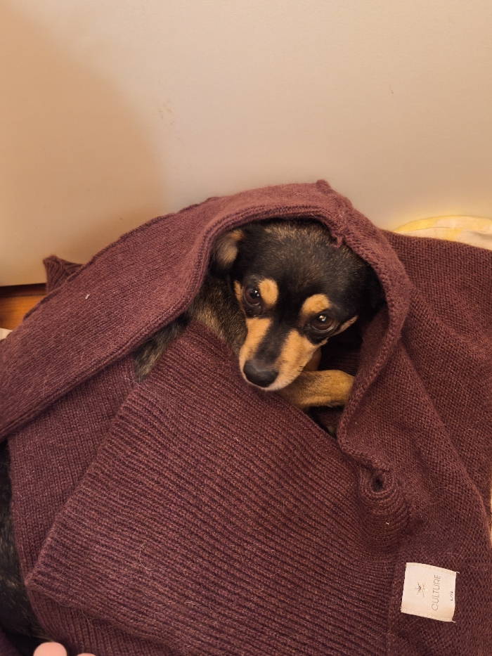 In the city of Avren, Bulgaria, a small, black and tan dog is observed partially concealed within a dark red, ribbed knitted garment