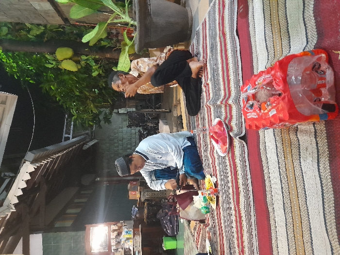 The image depicts an outdoor night scene in Mojokerto, Indonesia. Two adult males are seated on a red, white, and brown striped mat on a paved surface. The man on the left, wearing a white long-sleeved shirt and a dark grey peci (skullcap), is positioned with his legs crossed and is looking down towards an object on the mat between his knees. A dark red bag is near his left leg. The man on the right, wearing a light-colored patterned short-sleeved shirt and dark trousers, is seated with his legs extended, his bare feet visible. He is looking upwards and slightly to the right, with his right hand raised towards his mouth. On the mat between the two individuals, a white plate contains several slices of watermelon. Various small packaged snacks and a clear plastic bottle are also present. In the foreground, a six-pack of bottled water, encased in red plastic packaging, rests on the mat. The background on the left features a building structure with a traditional overhanging roof line, partially obscured by shadows. To the right, dense green foliage is visible, including a tree bearing two prominent green jackfruits. A large brown potted plant stands near the right edge of the frame. The scene is illuminated by artificial light sources, casting some reflections and shadows.