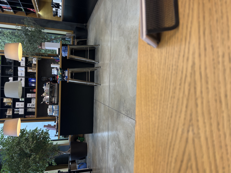 - "The image depicts the interior of a contemporary coffee shop or cafe, viewed from a low angle across a wooden surface" by FM-3gzhe2, licensed under CC BY 4.0
