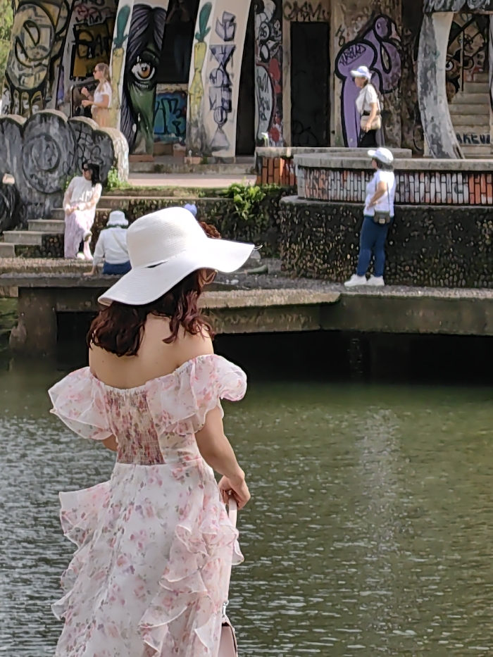 A woman with auburn hair, wearing a white wide-brimmed sun hat and an off-the-shoulder white dress with a pink floral pattern and ruffled tiers, is depicted from behind, facing a body of green water. She holds a light-colored bag in her right hand. The scene is located in Kim Long Ward, Vietnam. Behind the water and the woman, a multi-level concrete structure with a dark, textured base is visible. This structure is heavily adorned with various colorful graffiti, including abstract shapes, stylized letters, and a large green and brown face with a prominent eye. Several individuals are present on and around this structure: * On an upper level to the left, a woman with blonde hair, wearing a light-colored top and skirt, stands near a wall. * Below her, on a set of concrete steps, another woman in a light top and striped pants sits. * Further down and to the right, a person in a white bucket hat and a white top is seated on a lower ledge. * On a more prominent platform to the right, a woman in a white t-shirt, blue jeans, white sneakers, and a white baseball cap stands facing to the left, holding a small dark bag. * Above her, on a higher section of the structure, another woman in a white top and cap is partially visible, appearing to walk towards the right. The overall environment suggests an outdoor recreational area with a distinctive architectural element featuring street art, bordering a calm body of water under bright daylight.