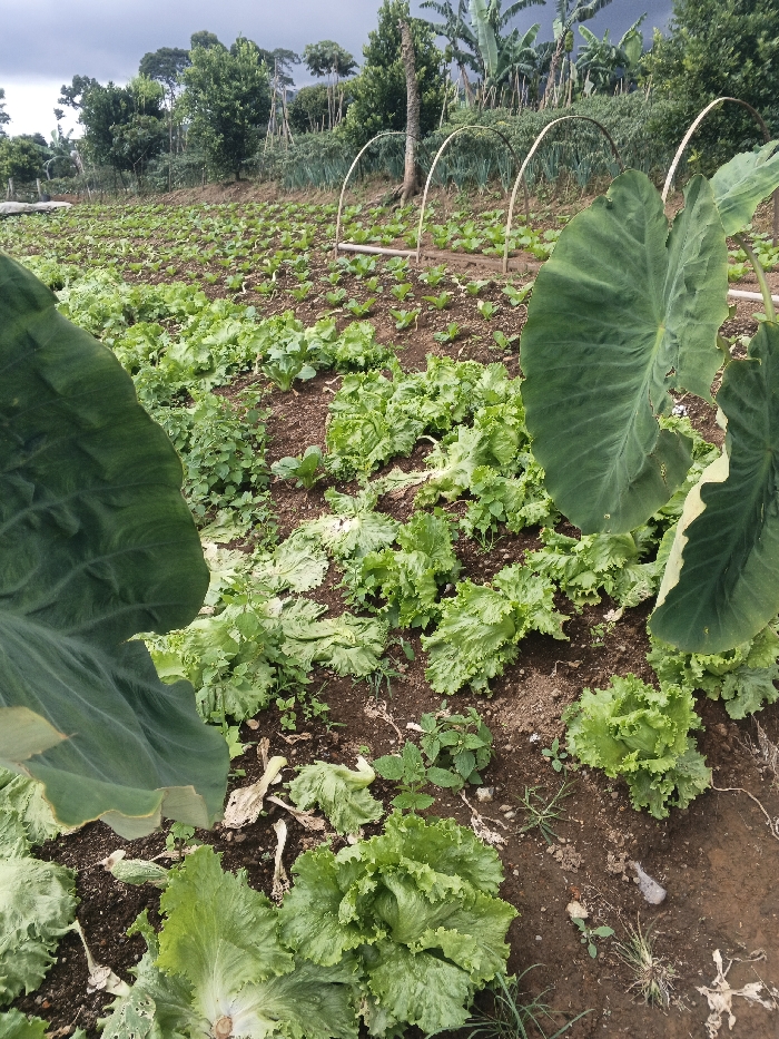 An agricultural field in Pô Kô, Vietnam, is depicted under an overcast, light grey sky. The foreground is partially framed by two large, dark green taro leaves (Colocasia esculenta). Rows of cultivated, vibrant green lettuce plants, appearing to be a loose-leaf variety, are prominently visible in the midground, growing in dark brown, tilled soil. Some lettuce plants show minor leaf damage or wilting. Further into the background, several light-colored, U-shaped arch supports, likely made of wood or thin metal, are positioned over rows of smaller, younger green plants. A dense line of diverse trees, including banana plants, forms a natural boundary along the far horizon of the field. No individuals or active agricultural processes are discernible within the frame.