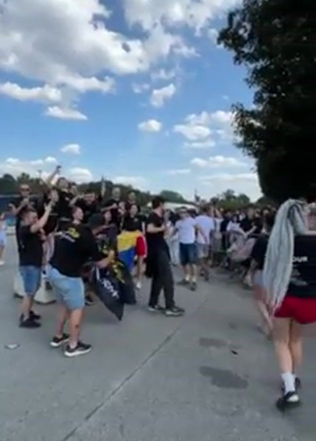 crowd of people gathered outdoors. Many people are standing on and around a raised platform, some raising their hands and appearing to celebrate. The crowd is lined along a road, behind a barrier. Some people are walking along the road. The sky is blue with scattered clouds, and there are trees in the background.