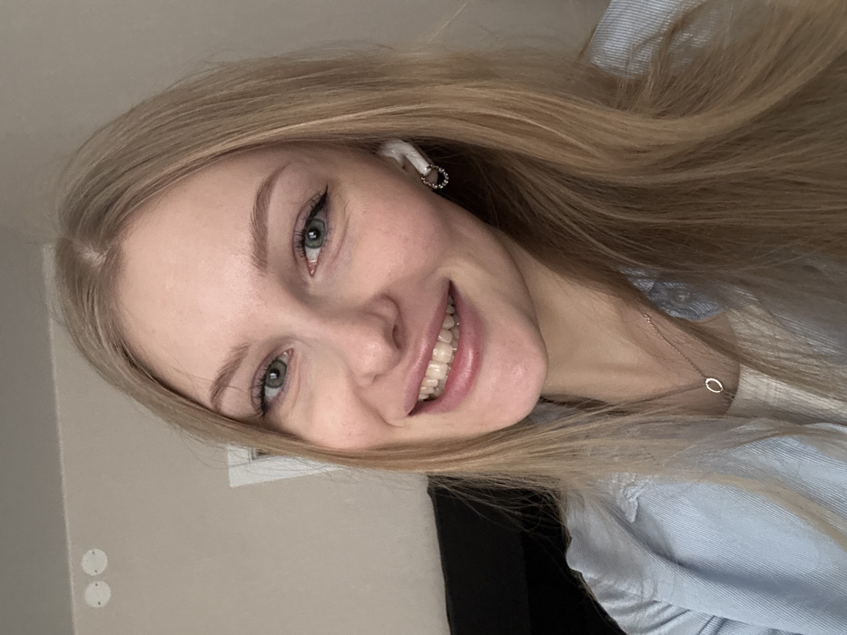 The scene captures a young adult female in an indoor setting within Perm, Russia. She is presented in a close-up portrait, looking directly at the viewer with a wide, open-mouthed smile. Her long, straight blonde hair cascades over her shoulders, framing a face with light-colored eyes defined by dark eyeliner. Clear aligners are visible on her upper teeth. She wears a light blue collared shirt over a white garment, adorned with a silver-toned necklace featuring a small, open oval pendant. A white wireless earbud is situated in her right ear, alongside a small, textured hoop earring. The immediate background is a plain, light beige wall. This wall features two small, circular, light-colored covers positioned in the upper left quadrant. A partial view of a white door or window frame is discernible vertically to the right. A dark, out-of-focus object is visible in the lower left portion of the background.