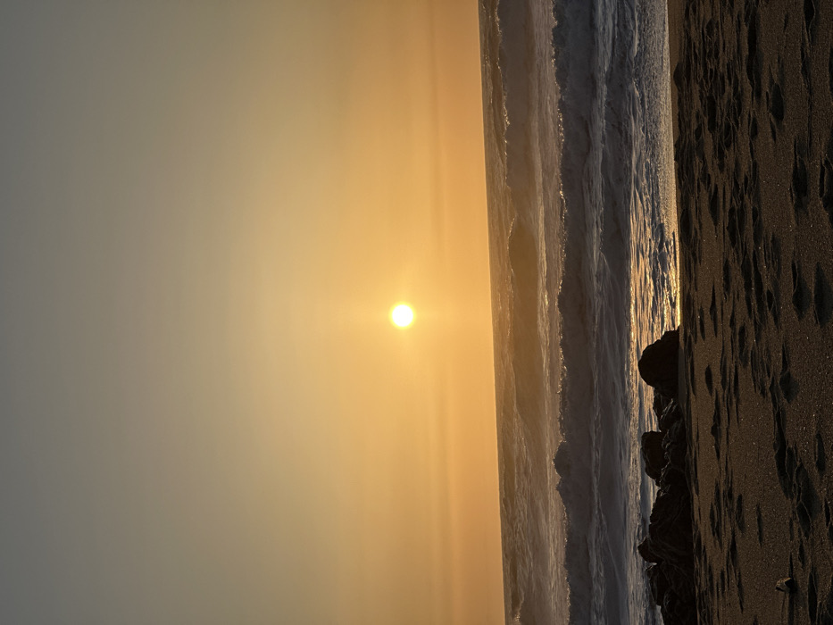 The image displays a sunset scene over a beach in Matosinhos, Portugal. A brilliant, circular yellow sun is centered in the upper mid-ground, low on the horizon, radiating a golden glow across the sky and ocean. The sky transitions from vivid orange and yellow around the sun to a lighter, pale blue-gray towards the top. Several lines of ocean waves with white foam crests are visible horizontally across the middle, reflecting the sun's light. The immediate foreground consists of dark, wet sand with faint indentations, likely footprints. A cluster of dark, irregularly shaped rocks is positioned on the left side of the sandy foreground, partially submerged by the waves. No human figures, animals, or artificial structures are discernible.