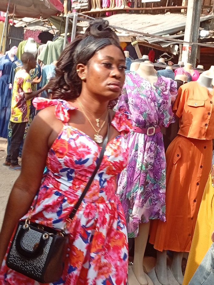 The scene depicts an outdoor clothing market in Fegge, Nigeria, under bright daylight. A female individual, approximately 20-30 years old, with dark skin and dark hair styled in an updo and worn down, occupies the foreground. She is wearing a sleeveless dress with a red, pink, and blue floral pattern on a white background, and a black cross-body handbag with gold hardware. Gold earrings, one with an ear cuff, and a gold chain necklace with multiple pendants are visible. Her gaze is directed towards the right of the frame. In the mid-ground, multiple headless mannequins display various dresses, including a purple floral print dress with a pink belt and an orange short-sleeved dress. Another male individual, partially obscured in the background on the left, wears a yellow and maroon patterned t-shirt and appears to be examining clothing on a rack. The background features more clothing displays, market stalls with metal framing, and corrugated roofing. The ground surface is indistinct.