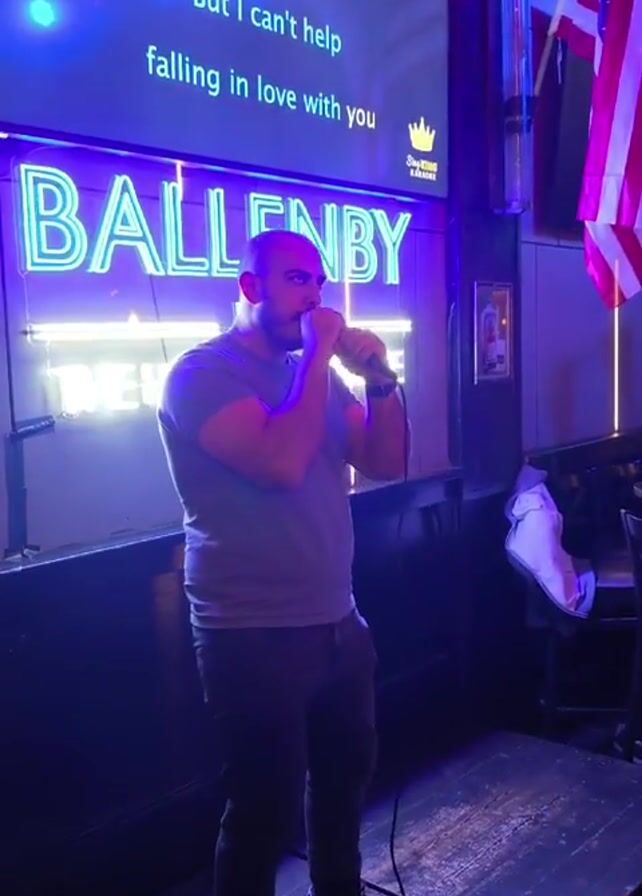 A man with a shaved head, wearing a gray T-shirt, dark jeans, and black and white shoes, is singing karaoke into a microphone at a bar. The karaoke screen displays lyrics from the song "Can't Help Falling in Love." Above the singer is a neon sign that reads "BALLENBY." The bar is decorated with American and Israeli flags, and small pennants hang from the ceiling. Other patrons are present, drinking and talking, some watching the singer. The lighting is dim and bluish.