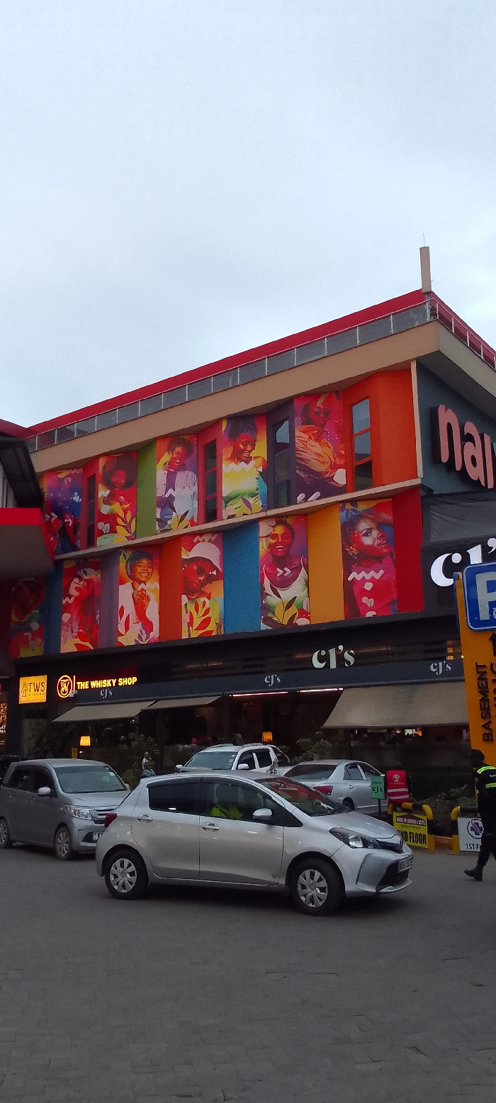 The image depicts a daytime street scene in Athi River ward, Kenya, under an overcast sky. A multi-story commercial building dominates the center-right, featuring a distinctive facade adorned with two horizontal rows of large, vibrant murals. These murals depict various smiling Black women against colorful, patterned backgrounds, interspersed with dark-framed windows. The building's upper section has a red trim and a light-colored vertical exhaust vent or chimney. At street level, the building houses businesses including "THE WHISKY SHOP" and "CJ's," both with dark awnings and prominent signage. A "TWS Bistro" sign is partially visible to the left. Below the awnings, faint outlines of individuals are present. On the paved ground surface, three vehicles are visible. In the immediate foreground, a silver five-door hatchback (likely a Toyota Vitz/Yaris) with a partially visible license plate "KDJ 311P" is positioned centrally. Behind it, a silver minivan is partially visible, followed by a silver sedan further back near the building. To the far right, a person dressed in dark clothing with a reflective yellow-green element on their arm or torso is walking right, partially out of frame. A blue and yellow parking sign indicates "BASEMENT PARKING" and "1ST FLOOR," accompanied by red and white striped bollards near the building's entrance.
