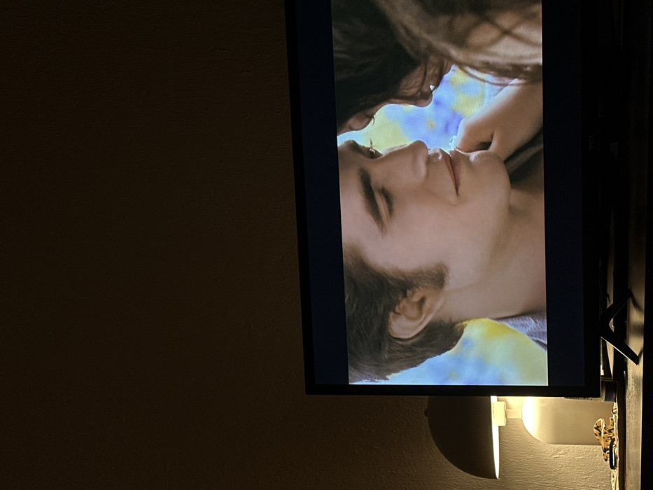 The image displays a dimly lit indoor scene featuring a flat-screen television and its immediate surroundings. The television, positioned centrally in the lower frame, shows a close-up of two individuals from a movie or television program. A light-skinned male with dark hair, visible in profile on the left, looks towards a partially visible female on the right, who has dark hair and whose hand is observed touching the male's chin. The on-screen background is blurred with blue and yellow hues. To the left of the television, a modern lamp with a dome-shaped shade emits warm light onto a textured, dark brown wall and the dark surface supporting the TV. A small, spotted, reptile-like figurine is also present on this surface. The specific location within Santa Ana Tepetitlán, Mexico, cannot be ascertained from the visual evidence.