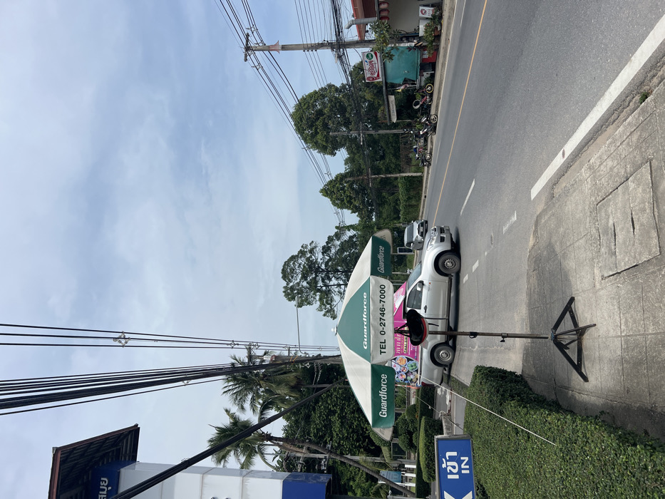 A white pickup truck is parked on the side of a road. A large green and white umbrella, branded with "Guardforce" and a telephone number, is positioned next to the truck, casting a shadow on the sidewalk. The sidewalk is bordered by green bushes and a blue sign that reads "IN." Overhead, there's a clutter of black power lines. Across the road, there are trees, some motorcycles, and buildings visible in the distance under a light blue sky.