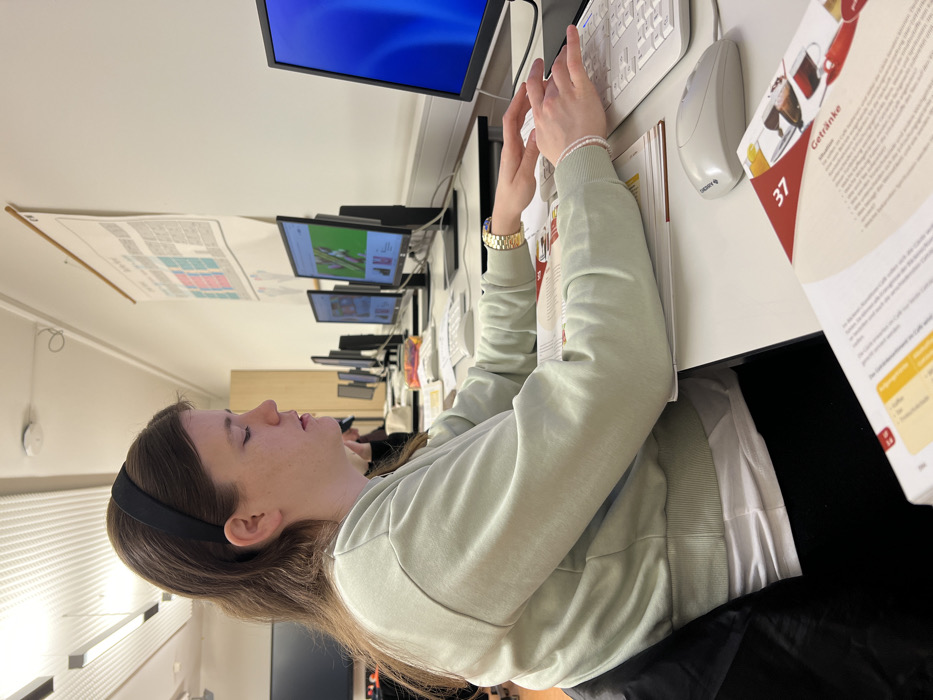 A female subject is depicted in profile, seated at a computer workstation in a classroom or computer lab located in Heilbronn, Germany