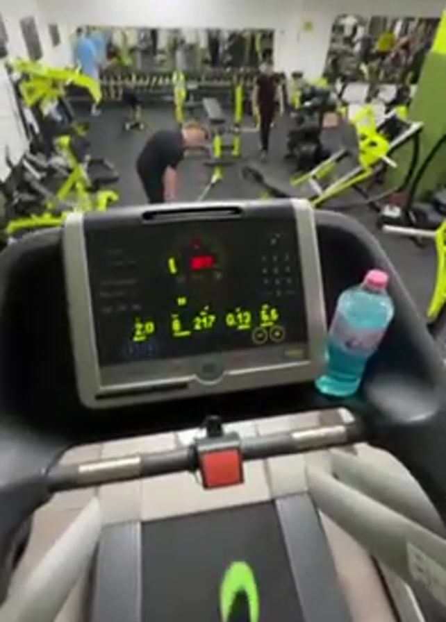 The camera shows the perspective of someone on a treadmill in a gym