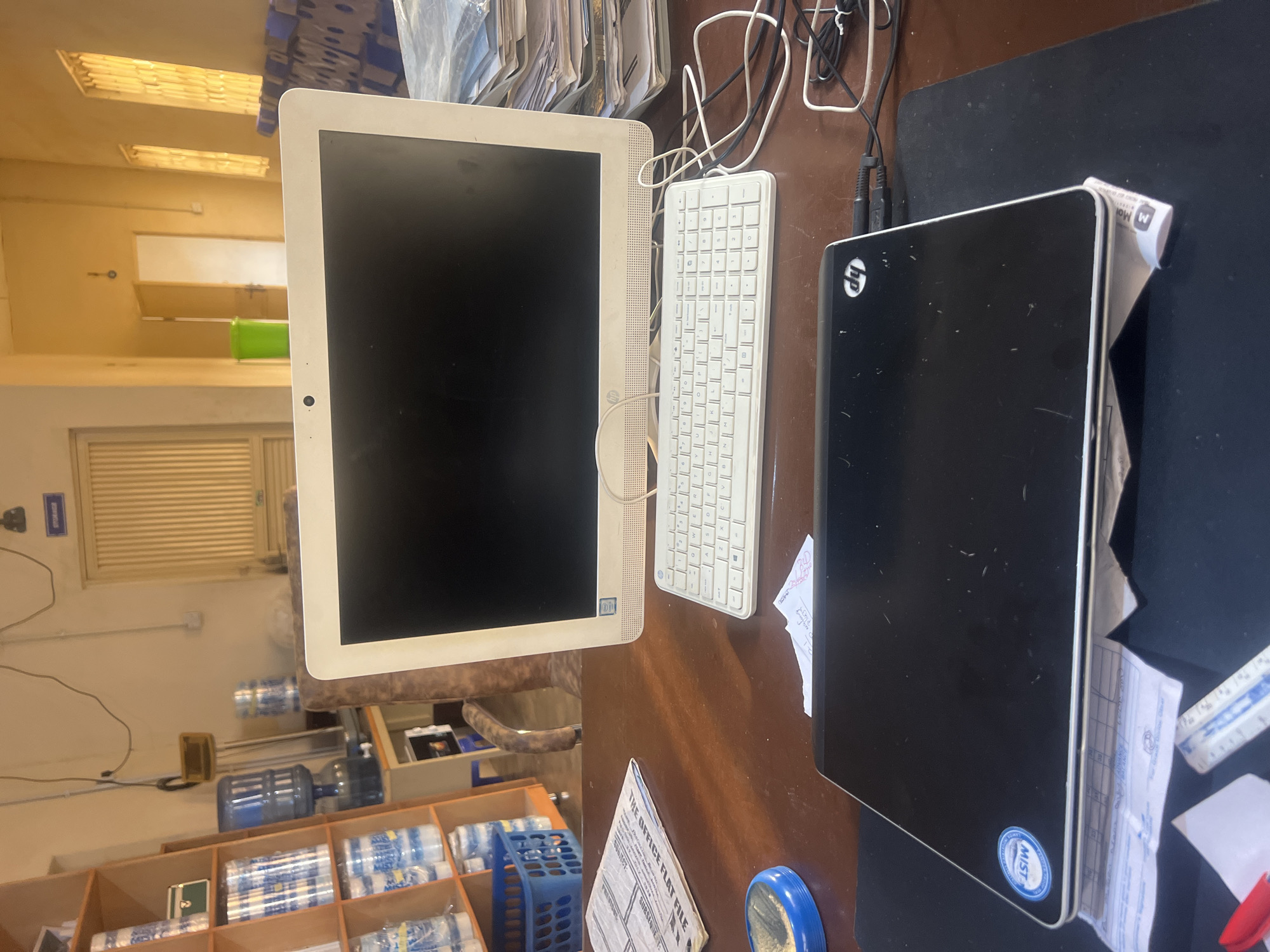 The image depicts a desk in an office setting. Prominent objects on the desk include an all-in-one computer with a blank screen, a white keyboard, and a black HP device, possibly a hard drive or small computer, with a visible "MIST" logo. Other objects include papers, a blue item (possibly a container), and various cables. In the background, shelves are visible, stocked with bottled water and other supplies. Water coolers are also present. The room appears to be lit by fluorescent lighting. Based on the "MIST" logo and the presence of bottled water, the location might be an office or administrative building within the city of Jos, Nigeria. No people are visible in the image.