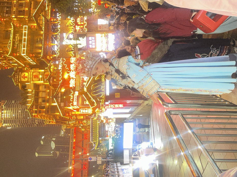 The image depicts a bustling night scene at the Hongyadong architectural complex in Yuzhong District, Chongqing, China. In the foreground, slightly right of center, a female individual is positioned from the waist up, facing right with a serene expression, her left hand resting on a silver metal railing. She wears an elaborate light blue traditional costume, consisting of a long pleated skirt, an intricately embroidered jacket with tassels, and a prominent silver-colored headdress adorned with floral and beaded elements. Behind her, occupying the right side of the frame, is a dense crowd of onlookers. Two individuals are closer: one in dark traditional attire with fur accents, looking towards the central figure, and another in a red jacket, also observing. The background is dominated by the multi-tiered, traditional Chinese-style buildings of Hongyadong, brightly illuminated by golden LED lights that highlight their elaborate roofs and structures. To the left, a paved street or ramp ascends, where a white vehicle with bright headlights is visible, along with a partially obscured blue road sign. Modern skyscrapers and a prominent red-lit bridge or elevated road are discernible against the dark night sky in the far background, completing the urban landscape.
