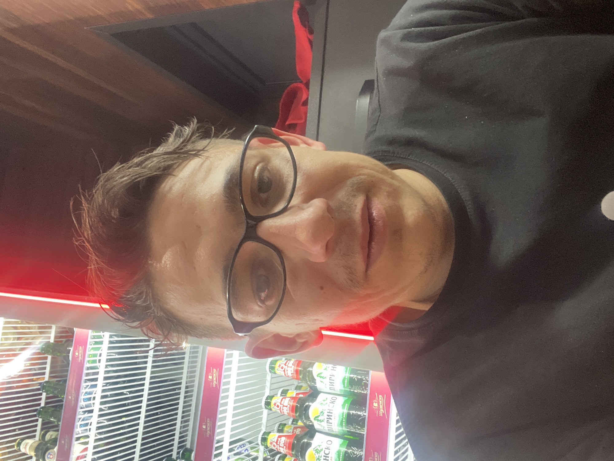 An adult male is depicted in a close-up, selfie-style image taken indoors in Dolna Mitropolia, Bulgaria. The subject has short brown hair, wears black-framed glasses, and has a light mustache and stubble. He is wearing a black t-shirt and looks directly into the camera with a neutral expression. To the left of the subject, a white commercial beverage refrigerator is visible, containing multiple green glass bottles. Labels on these bottles feature Cyrillic text, specifically "ПИРИНСКО" and "ШУМЕНСКО," identifying them as Bulgarian beer brands. A prominent vertical red light strip emanates from the left, illuminating a portion of the scene. To the right of the subject, a dark wooden or laminate panel is visible above a dark shelf, upon which a crumpled red fabric item rests.