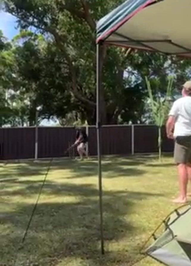 A man wearing a dark gray T-shirt, light-colored shorts, and a baseball cap is bowling in a backyard with grass. He is facing a set of wickets, and after he bowls, he raises his arms in celebration. Behind him, there is a brown fence, trees, and a canopy. To the side, there is a tent. The camera's view is partially obstructed by the pole of the canopy.