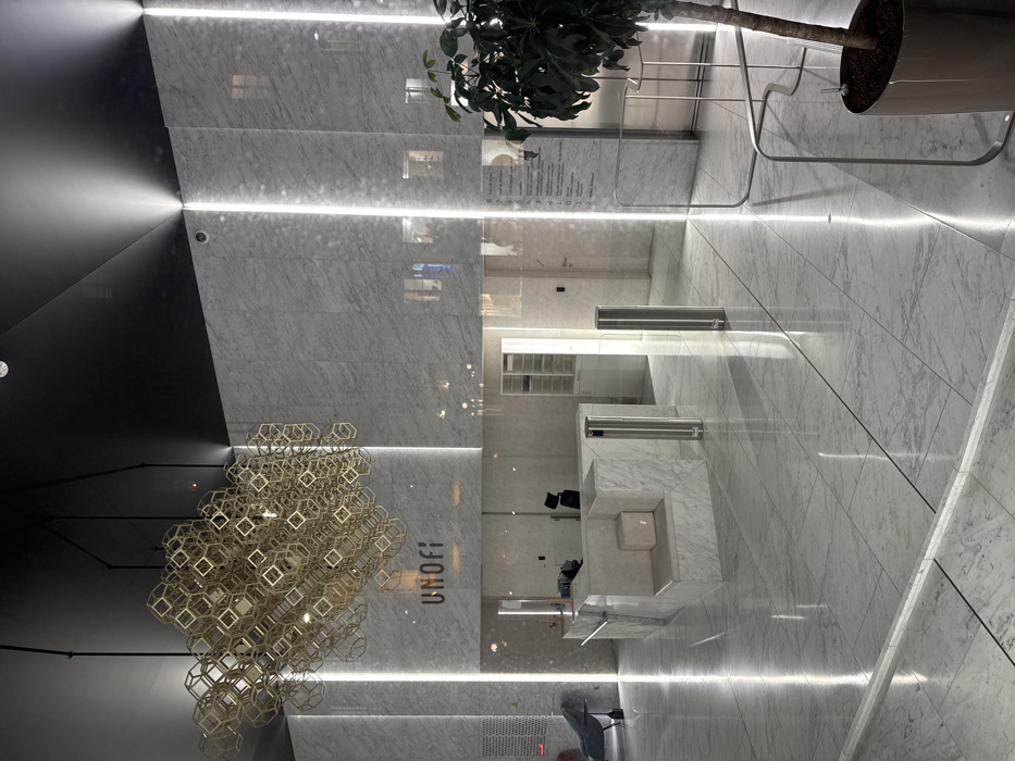 The image depicts the modern, well-lit lobby of UNOFI, located at 41-43 avenue Kléber in the 16th arrondissement of Paris, France. The scene features a spacious interior with polished white marble covering the floor and walls, contrasted by a dark, possibly black, ceiling. A prominent, large, gold-colored chandelier composed of numerous interconnected geometric, hexagonal, and square shapes hangs from the ceiling. Directly below it, the illuminated word "UNOFI" is affixed to the marble wall. In the center of the lobby stands a substantial, multi-level reception desk constructed from white marble. One individual is partially visible from behind, seated at the reception desk, facing away from the viewer. Two tall, cylindrical, silver-colored access control bollards are positioned on the marble floor in front of the reception desk. To the left, a light-colored, minimalist lounge chair with a dark base is visible near a wall vent. To the right, a large potted plant with dark green leaves in a grey planter sits beside a curving silver metal railing. A directory or sign in French is mounted on the far right marble wall, listing floors and services. The highly reflective marble floor mirrors the vertical LED strip lighting embedded in the walls and other interior elements. In the background, beyond the reception desk, additional doorways, glass partitions, and shelving units are visible.