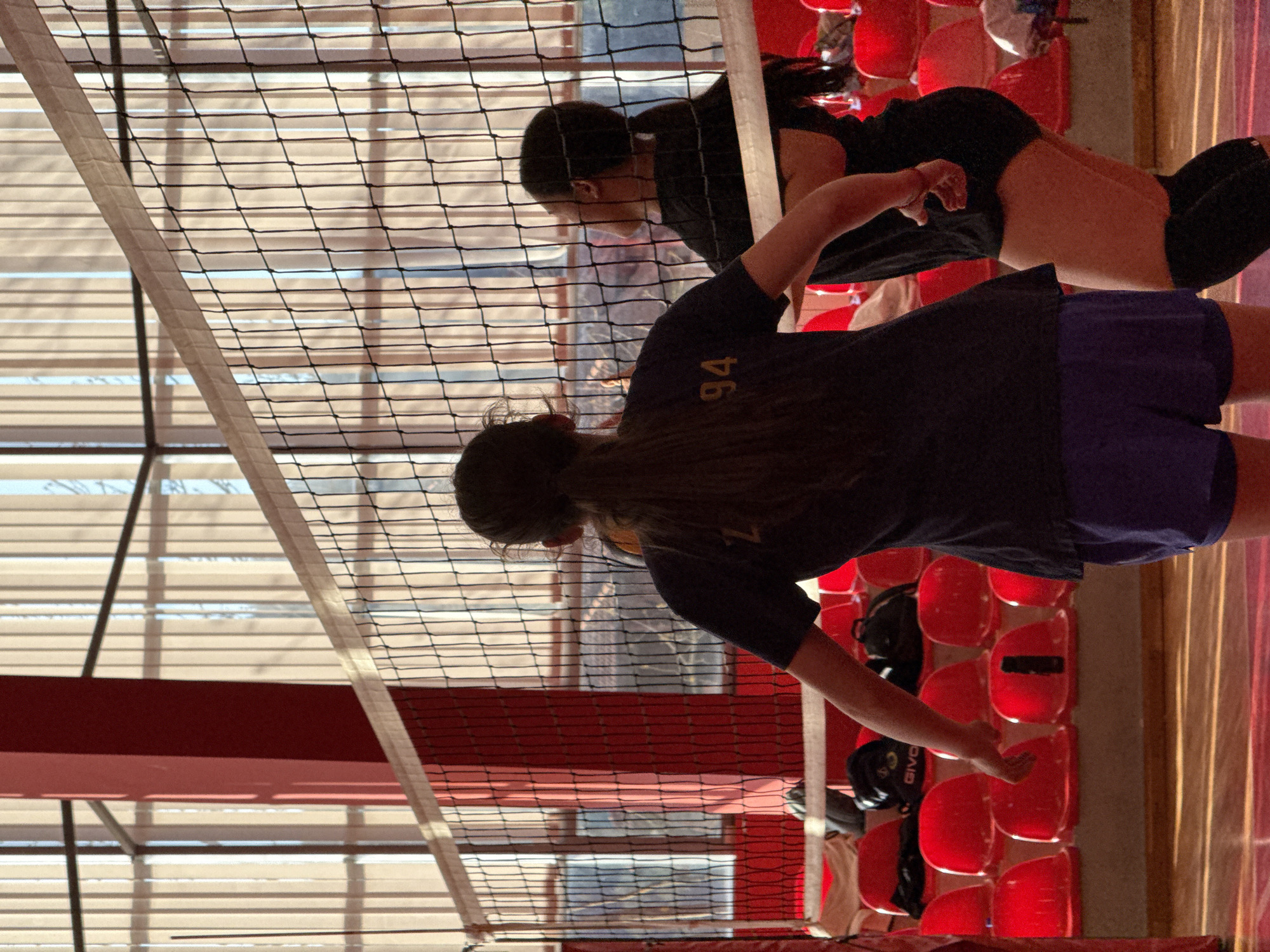 A sideways, medium shot shows two girls playing volleyball indoors. The foreground girl wears a navy t-shirt with a visible "94" on her back and purple shorts. Her arm is extended as she plays. The background girl wears a black top and black shorts. A volleyball net is prominently displayed in front of the girls. Seating appears on the right of the image. The location is identifiable as Etropole, Bulgaria, due to the distinctive red seating present in images of the municipality's venues. The ceiling has wooden blinds behind a metal structure.