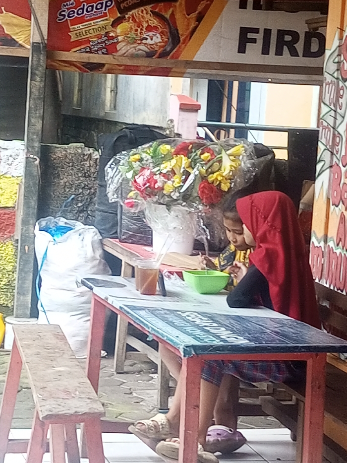 Two children sit at a red and blue table, one in a red hijab. They're eating from a green bowl with straws in a glass nearby. Flowers wrapped in plastic are behind them, along with a large white bag and a menu above. A small stool stands to the left of the table.