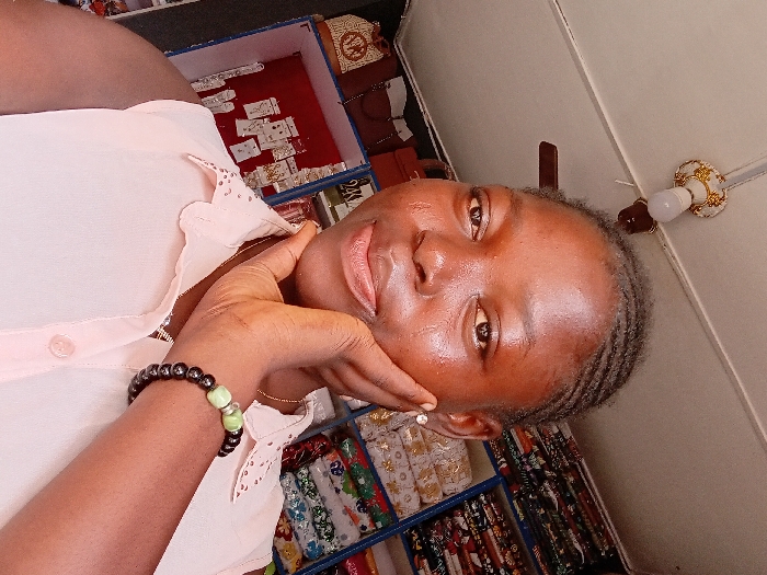 This image depicts a young adult female, appearing to be of African descent, positioned centrally in a close-up, selfie-style photograph taken indoors within a commercial establishment in Ayob, Nigeria