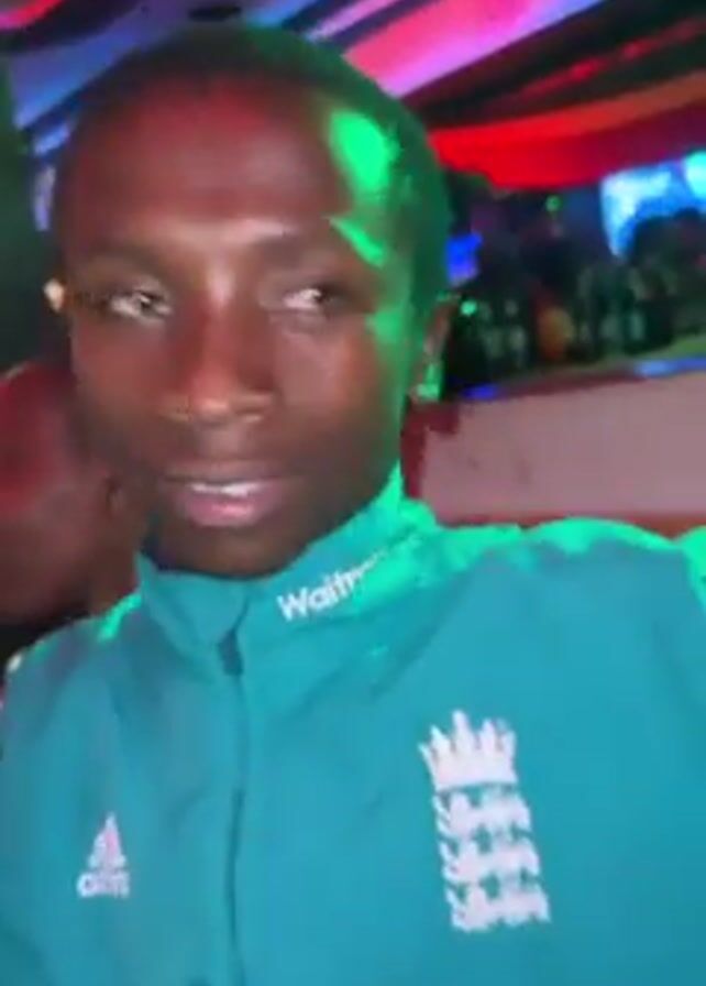 A person wearing a turquoise Adidas jacket with the words "Waitrose" and an English crown logo on the collar is dancing in a dimly lit, crowded nightclub