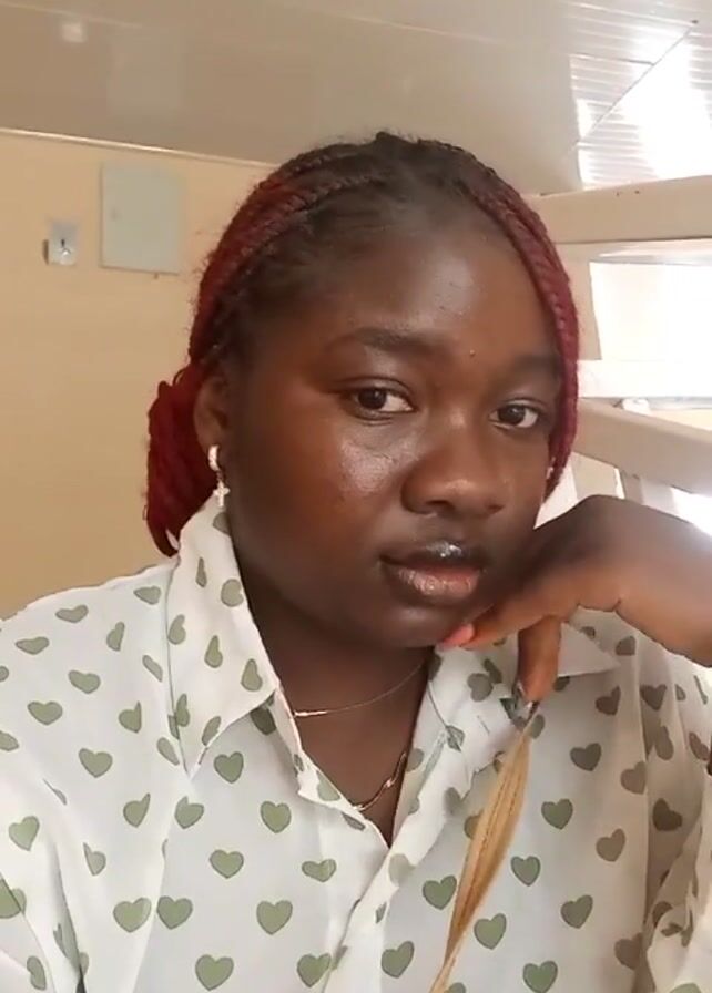 A medium shot of a person, seemingly female, sitting indoors. The person has dark skin, brown eyes, and dark, thick eyebrows. They are wearing a white button-down shirt with a pattern of green hearts. The shirt has long sleeves. Around their neck is a thin gold necklace. They have a purse strap over their left shoulder. They have a red and black braided hairstyle, with the braids pulled back on the left side. The person is resting their chin on their right hand. The background includes a white ceiling with a light fixture, a white railing behind the person, and a light yellow wall on the left side of the frame. The person looks directly into the camera.