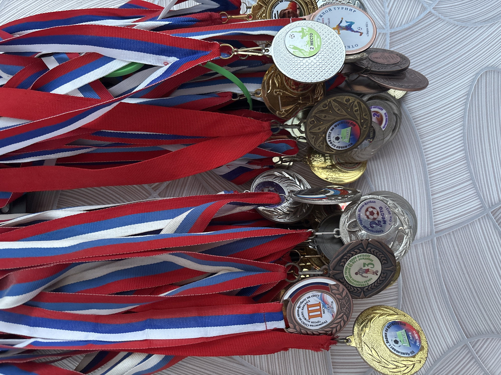 The image displays a collection of sports medals with ribbons in the colors of the Russian flag (red, white, and blue)