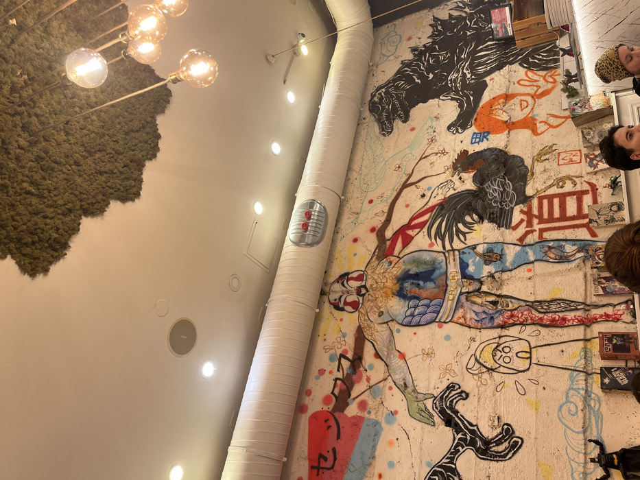 A high-angle shot reveals a wall mural adorned with diverse imagery: a black Godzilla-like figure, a rooster, a human-like figure in a fetal position, and a black claw. Adjacent to the mural is a white ventilation pipe with a red-accented detail. The ceiling features modern lighting fixtures, including exposed bulbs and a moss-like installation. People are partially visible in the frame's corner.