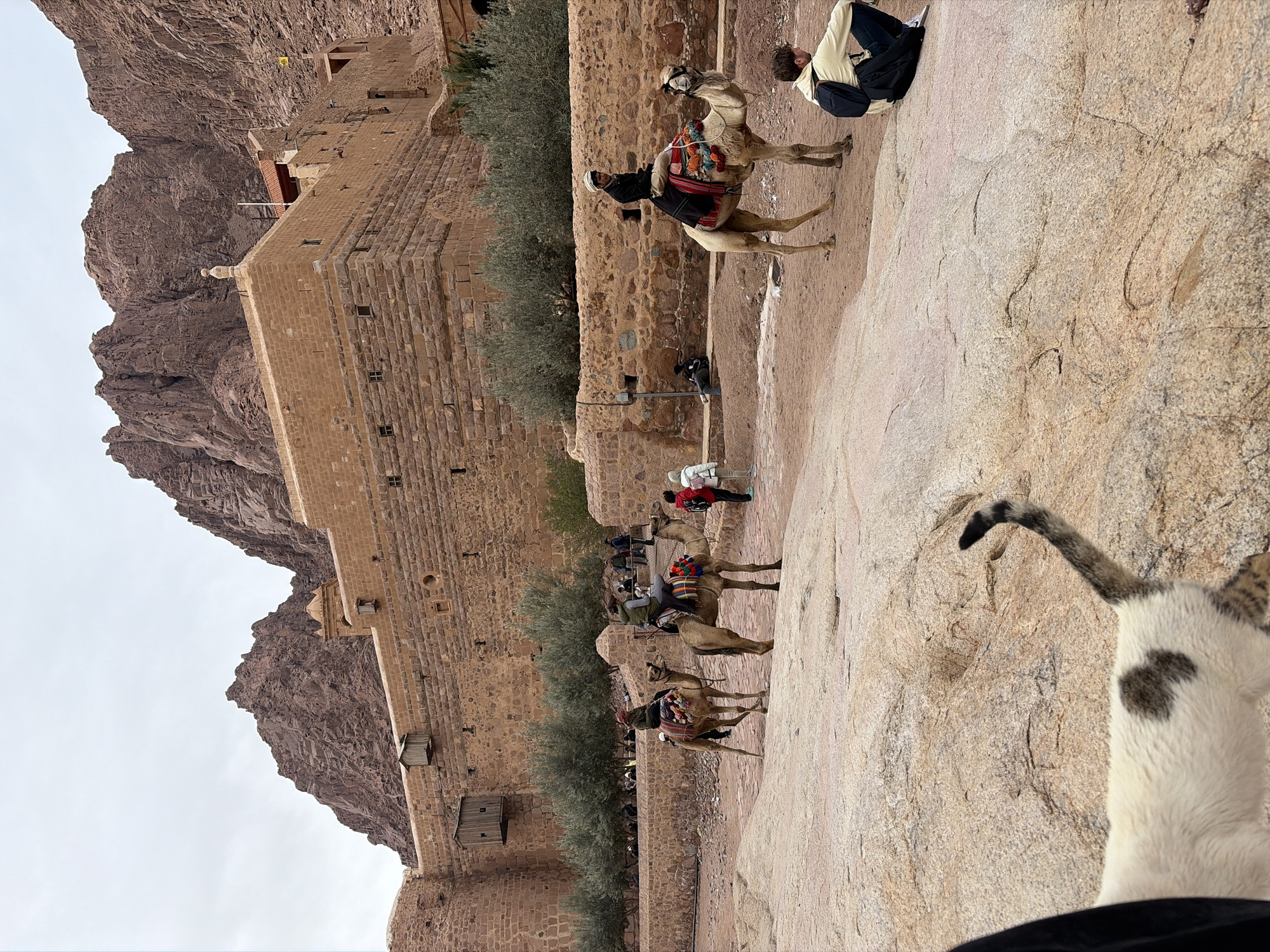 This photograph, taken at the Saint Catherine’s Monastery site in the city of Saint Catherine, Egypt, shows a stone path with a line of camels bearing riders. The backdrop includes stone architecture and mountains. A white cat with a dark spot on its back is prominent in the foreground, near the bottom right corner of the frame. A person wearing dark clothing is visible at the bottom of the frame. Other people and camels are seen in the background along the path.