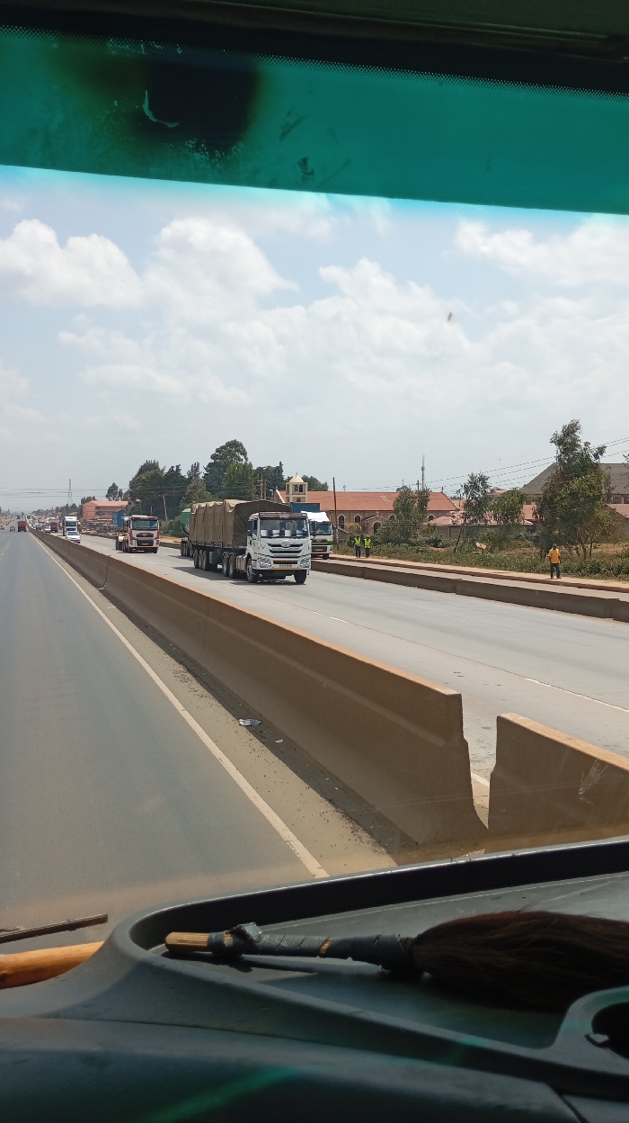 The image depicts a daytime scene from inside a vehicle looking out onto a multi-lane highway in Limuru Central ward, Kenya