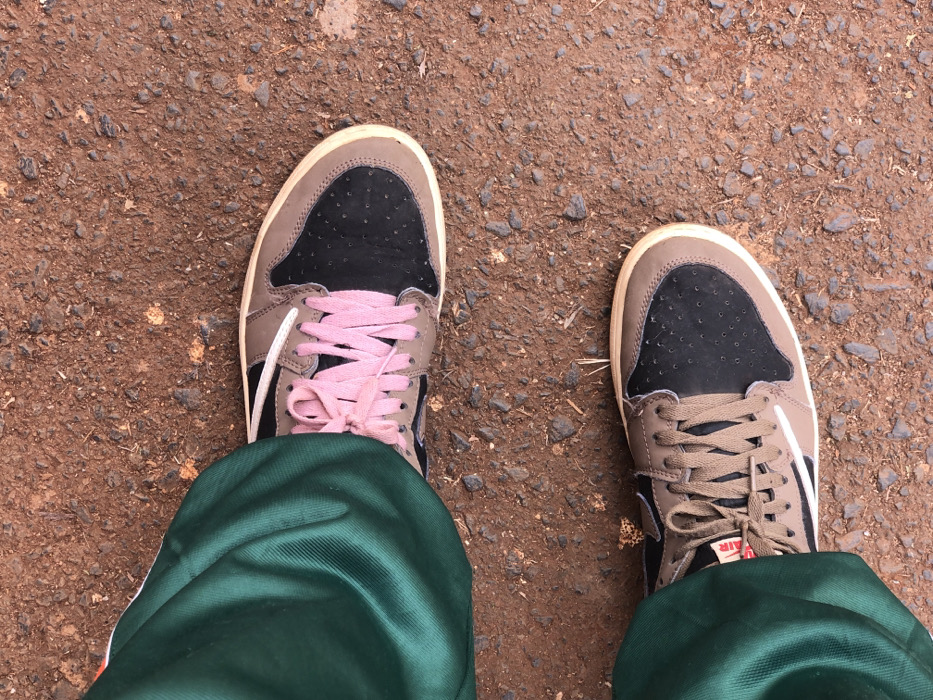 An overhead forensic image depicts the lower legs and feet of an individual standing on a reddish-brown, compacted dirt surface in the city of Unknown, Kenya. The individual wears loose-fitting, emerald-green fabric pants that partially obscure the tops of two high-top sneakers. Both shoes feature black toe boxes, brown/tan leather overlays, white midsoles, and black outsoles. The shoe on the left (viewer's right foot) is secured with bright pink laces and displays an inverted swoosh on its lateral side. The shoe on the right (viewer's left foot) is secured with light brown laces, and a red "AIR" tag is partially visible on its tongue. The ground contains numerous small, dark grey pebbles and sparse dried plant matter.