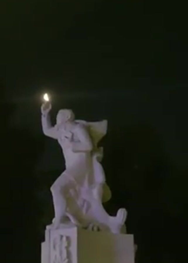 statue at night. It is a white statue of a man in motion, holding his right arm raised toward the sky. The moon appears near his outstretched hand. The statue stands on a square plinth that has a design on its front. Dark trees are in the background. The sky is dark.